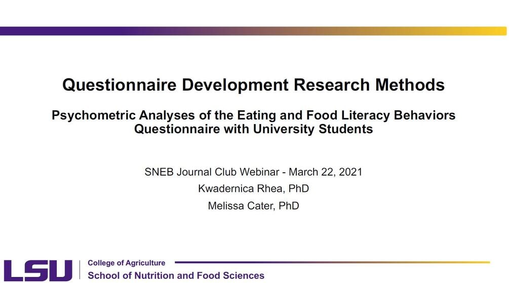 This webinar will focus on the methods used to develop and validate the Eating and Food Literacy Behaviors Questionnaire(EFLBQ) with young adults. We will explore our use of factor analyses to measure young adults' perceived food literacy and behaviors toward food and development of an explanatory model.